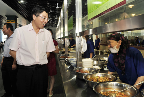 当天上午,在校党委副书记徐养福陪同下,孙其信校长到后勤服务中心召开座谈会,听取中心负责人工作汇报,随后察看了学生浴室、宿舍、食堂,慰问工作人员,中午还专门在北校区清真食堂与学生共同就餐。