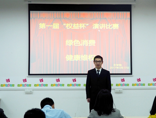 为了增强大学生的维权意识,提高大学生的维权能力,在3·15国际消费者权益日到来之际,主题为“绿色消费,健康维权”的第一届“权益杯”演讲比赛于3月17日在农科大楼742如期举行,此次活动由农学院权益部主办,到场嘉宾有农学院高雪纯老师,团工委副书记李格格,学生会主席李宜谦,副主席季祥、尹邦益。