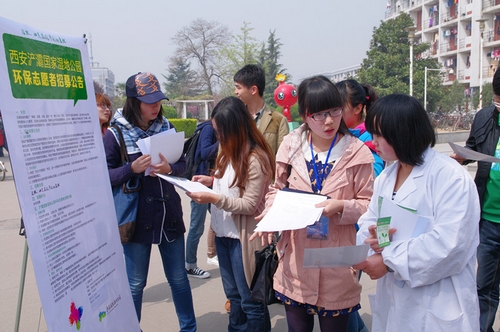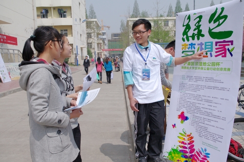 近日,大学生科技创新协会在学生西区举行了西安浐灞国家湿地公园志愿者招募暨陕西省大学生环保公益行动创意竞赛宣传活动。
