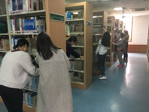 下午三点半,志愿者们早早地来到了图书馆门前等候,由社践部部长带领大家有序进入。首先,他们进入图书馆北中心书库,和工作人员说明来意,管理员便把志愿者们分成两队。两队志愿者分别去往不同的阅读室,问询过管理员后,他让志愿者们分别进行图书整理工作和擦洗图书架上的灰尘。得到指令后,队员们开始分头行动,男同学负责去楼下提水,女同学则挽起衣袖开始清洗抹布。摆放图书也是一大挑战,因为不知道书上的标签所表示的含义,志愿者们请教了管理员,他耐心地解释了每个字母和数字代表的含义,根据这些,便可以迅速地找到图书应该在的位置。大约两个小时之后,两队志愿者都完成了相应的工作,管理员对志愿者们表示了感谢,并和志愿者们在工具书阅览室合影留念。