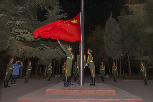 随着清晨的第一道朝霞浮现,迎着朝阳,国旗护卫队队员们迈着铿锵的步伐来到了国旗台下。在激昂的《义勇军进行曲》中,在初升的阳光映照下,升旗手振臂一挥,鲜艳的五星红旗迎风展开,徐徐升起。全体学生肃立,目光中充满着热切与希冀,满怀对祖国无限的热爱和崇高的敬意。