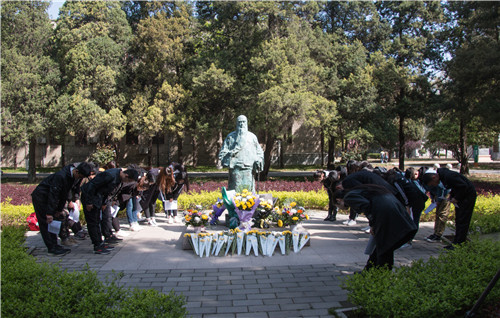 三号教学楼前,是开发西北、以学救国的建校元老于右任先生;“辛辛苦苦、独树一帜”的老校长辛树帜先生的雕像。北校区图书馆旁,摆放的塑像是中国植物病理学开拓者、抗日志士李振岐院士;用一个小麦品种拯救了大半个新中国的赵洪璋院士。凤岗通讯社社员依次向塑像献花、鞠躬,在领诵同学的带领下,成员们重温先辈的求索历程、齐读先辈的治学语录。之后通讯社成员前往水保所,和研究生一道,聚集在虞宏正教授塑像前慎终追远、寄托敬意。