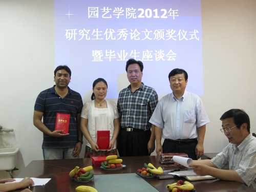 会上,马锋旺副院长宣读了《园艺学院关于表彰2012年研究生优秀学位论文获得者的决定》,肖斌书记和邹志荣院长为院级优秀博士学位论文获得者刘丙花、王顺才、王翰以及优秀硕士学位论文获得者杜艳民、许腾飞、常燕霞、杜俊娜等7名同学颁发了荣誉证书。