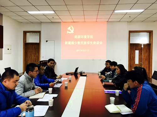 3月1日下午,资环学院在学院307会议室召开新疆籍少数民族学生座谈会。新疆内派教师郭长友,努尔模达,学院团工委书记刘庆麟出席会议,会议由学院辅导员李腾主持,各年级新疆籍少数民族学生到场参会。