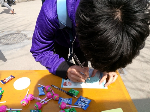 小小便利贴寄托美好心声。“3•25”活动当天,心咨部在北校区西雕附近举行了“拥抱自己 善待自己”便利贴寄祝福活动,旨在引导同学们树立积极乐观的生活态度。活动的主要形式是让同学们在便利贴上书写下对自己的期望、心愿等并贴在画板上,此外现场还开展了心理健康知识问答,参与的同学们也都收到了心咨部精心准备的小礼品。本次活动吸引了本校区及来自南校的多名同学的热情参与,有同学写下了对自己即将进行的四六级考试的期望,也有同学写下了对自己的今后大学生活、学习的规划等等。