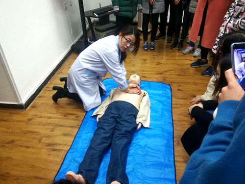 陈宁医生首先向师生们阐述了现代救护理论。然后对现场急救的步骤进行了说明:一是判断意识,现场发现有人突然倒地,确定急救场所的安全性后,应该立刻检查患者的反应性,并对其喊话或摇轻动其肩部;二是启动急救系统,如果患者没有反应、没有呼吸或仅仅是喘息,则施救者应怀疑发生心脏骤停,应及时呼救电话120;三是检查大动脉搏动脉,进行胸外按压;最后开放气道,解除舌肌对呼吸道的堵塞。讲解之后,陈宁医生组织同学们上台用人体模型进行心肺复苏训练,现场同学态度认真,积极配合。通过这次生动、有效的讲座,学生们不仅体会到急救知识的重要性,还了解了什么是心肺复苏,并掌握了心肺复苏的技能,相信在今后的学习生活中,当遇到一些突发情况时,我校师生都能够有能力救助他人的生命。