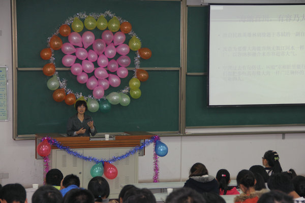 金花主任首先用一则哲理故事讲述了奉献的美好意义,并用林则徐“海纳百川、有容乃大”的名言勉励同学们要有大海一样广阔的胸怀。她指出,青春是笔财富,每个人要懂得拥有与给予。她用埃里克森八个阶段的理论分析了人在成长的不同阶段的心理特征与精神需求,提醒同学们要关注自己的心理健康问题。