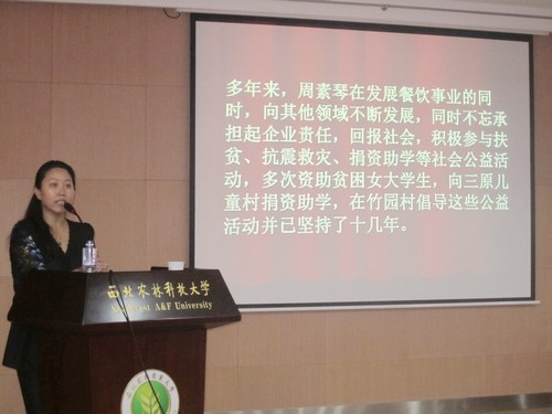 报告会上,周素琴女士首先从自身的创业经历说起,讲述自己从卖豆腐的工作开始、到学摄影、最后到竹园村系列企业创办的历程,都离不开一步步的努力和奋斗。全年无休的坚韧、诚信经营的执著、学习技艺的虚心、注重开创的头脑,通过一点一滴地积累成就了自己的事业。接着,她希望同学们能放松心情、放飞理想,在今后的人生历程中保持真诚乐观,用自己的汗水与智慧做人生的成功者。