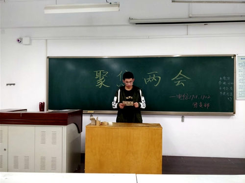 为使同学们全面了解两会精神,关注实时政治,参与政治生活,电信1701、1702班于3月7日下午在八号教学楼310教室组织主题班会——聚焦两会。两班同学积极参与,现场气氛活跃。